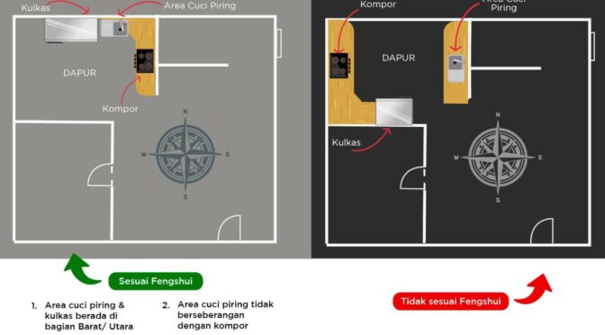- Posisi Kompor – Kompor melambangkan elemen api dan rezeki. Idealnya ditempatkan menghadap selatan atau timur, serta tidak bersebelahan langsung dengan wastafel atau kulkas (elemen air).